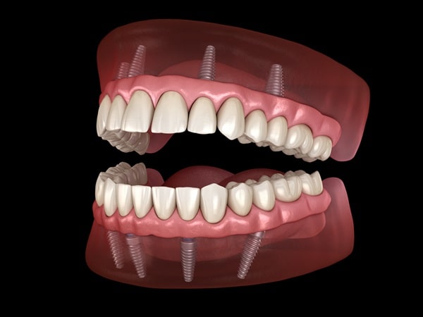 Here’s how it works. The dentist places two implants near the front of the jaw and two near the back, each at an angle that helps them stay secure. A custom bridge connects to those implants, replacing a full set of teeth on either the top or bottom.